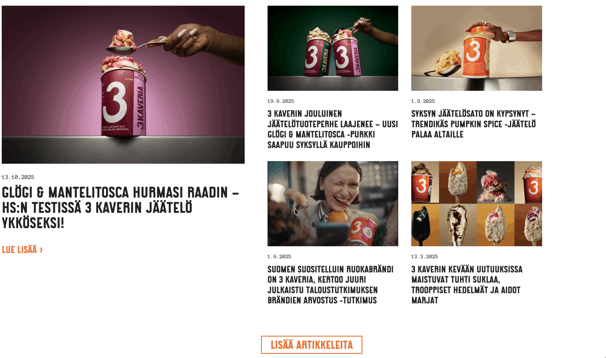 3 Kaverin verkkosivut eivät ole pelkkä tiedotuskanava – ne ovat tärkeä osa brändikokemusta. Sivuston ulkoasu, sisällöt ja käytettävyys viestivät samoja arvoja kuin jäätelöpurkin etiketti: aitous, rehellisyys ja hyvä fiilis.