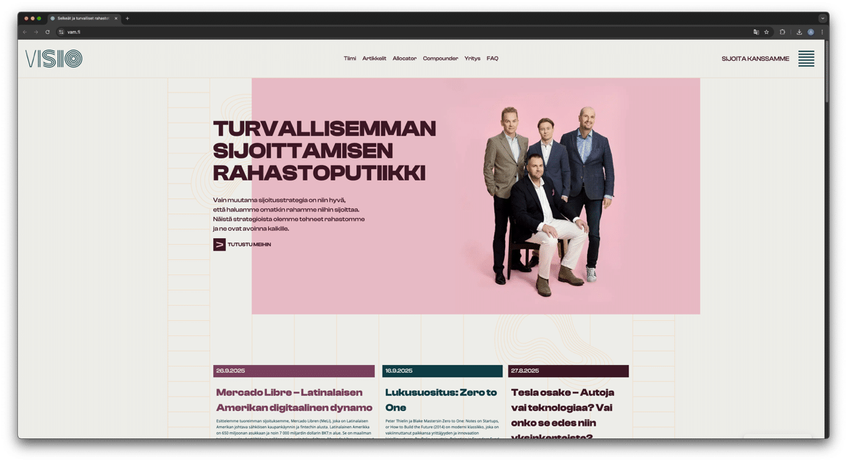 Visio Varainhoito Oy kuvaa itseään ”rahastoputiikiksi” – pieneksi ja ketteräksi sijoitusalan toimijaksi, joka haluaa olla lähellä asiakkaitaan. Kun he alkoivat etsiä verkkosivukumppania, suunta oli selvä.
