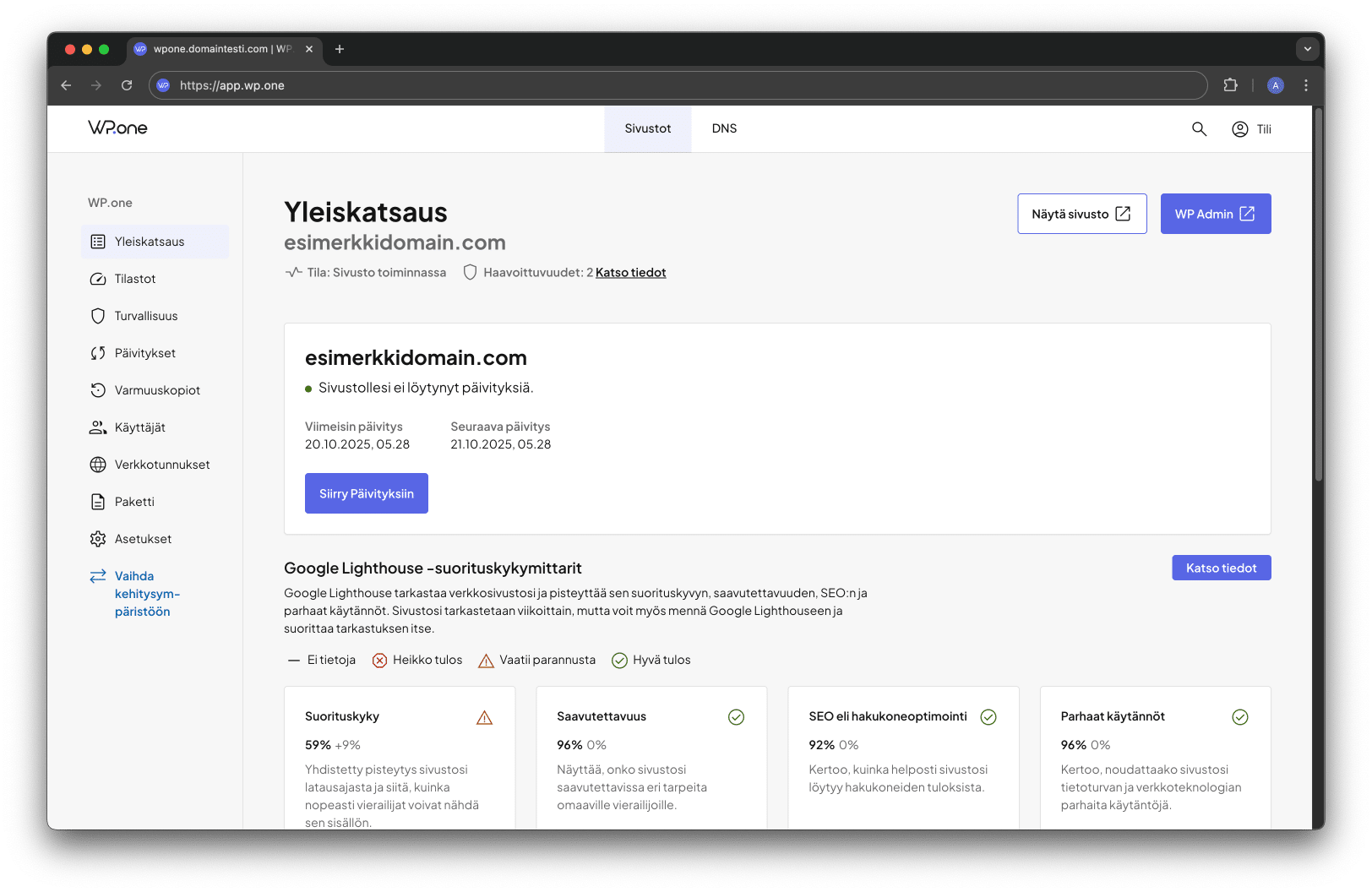 WP.one:n hallintapaneeli tekee sivustojen hallinnasta helppoa myös loppuasiakkaille. Se tarjoaa selkeän näkymän sivustojen tilaan, optimointiin ja mahdollisiin päivityksiin – kaikki yhdestä paikasta.