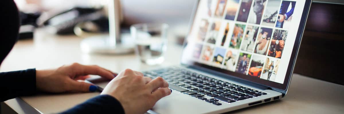 Ilmaiset kuvapankit auttavat esimerkiksi blogikuvien löytämisessä. Nainen etsimässä sopivia kuvia blogia varten.