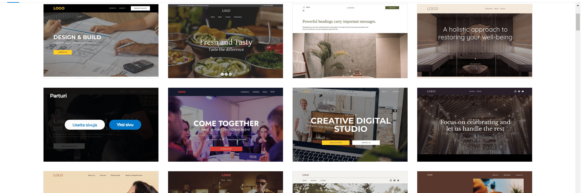 Jos haluat luoda sivustosi manuaalisemmin, voit valita jonkin valmiista ulkoasumalleista ja aloittaa sivustosi sen pohjalta. Kotisivukone sisältää yli 150 erilaisille yrityksille ja projekteille sopivaa, ammattimaista mallia.
