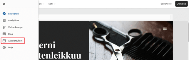 Pääset Varauskalenteriin klikkaamalla vasemmassa yläkulmassa olevaa päävalikkoa, jonka jälkeen valitse Ajanvaraukset.