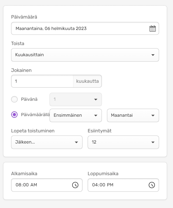 HUOM! Yllä olevassa esimerkissä tapahtuma toistuu jokaisen kuukauden ensimmäisenä maanantaina seuraavan 12 kuukauden ajan.