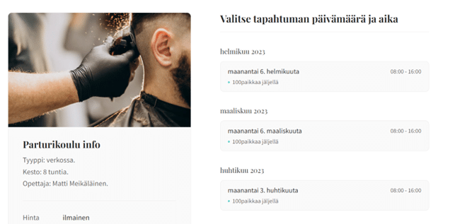 Uusi tapahtuma on nyt näkyvissä Palvelut-sivulla ja asiakkaat voivat tehdä varauksia siihen.