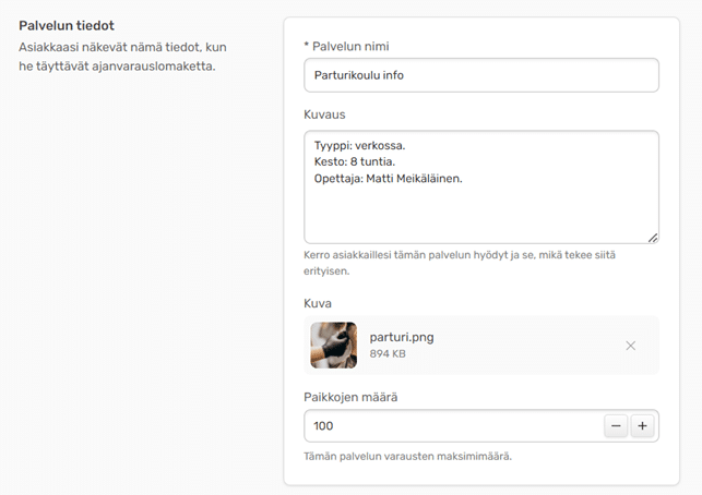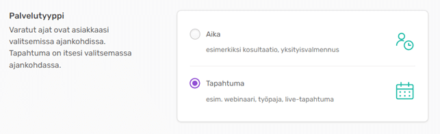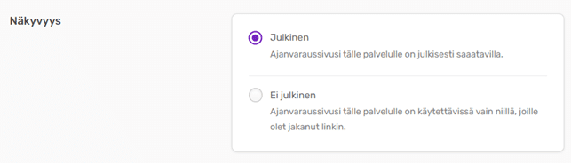 Palvelu voi olla Julkinen tai Ei julkinen. Ei julkinen -tyyppinen palvelu ei näy sivustollasi, mutta asiakkaat voivat ilmoittautua tapahtumaan toimittamasi linkin kautta.