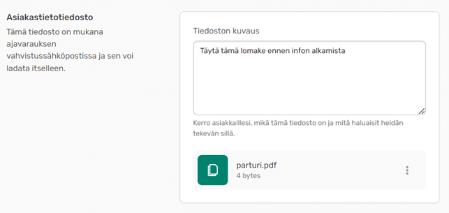 Halutessasi voit liittää varausvahvistukseen PDF-tiedoston asiakkaalle. Tiedosto tulee ladattavaksi varausvahvistusviestiin.