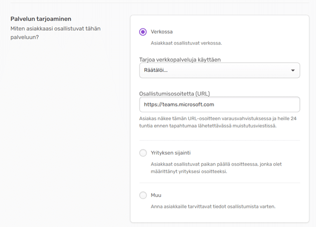 • Verkossa: asiakas saa määrittelemäsi osallistumislinkin varausvahvistuksen yhteydessä.