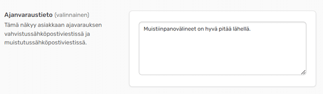 Jos haluat sisällyttää lisätietoa varausvahvistusviestiin, voit lisätä sen tähän.