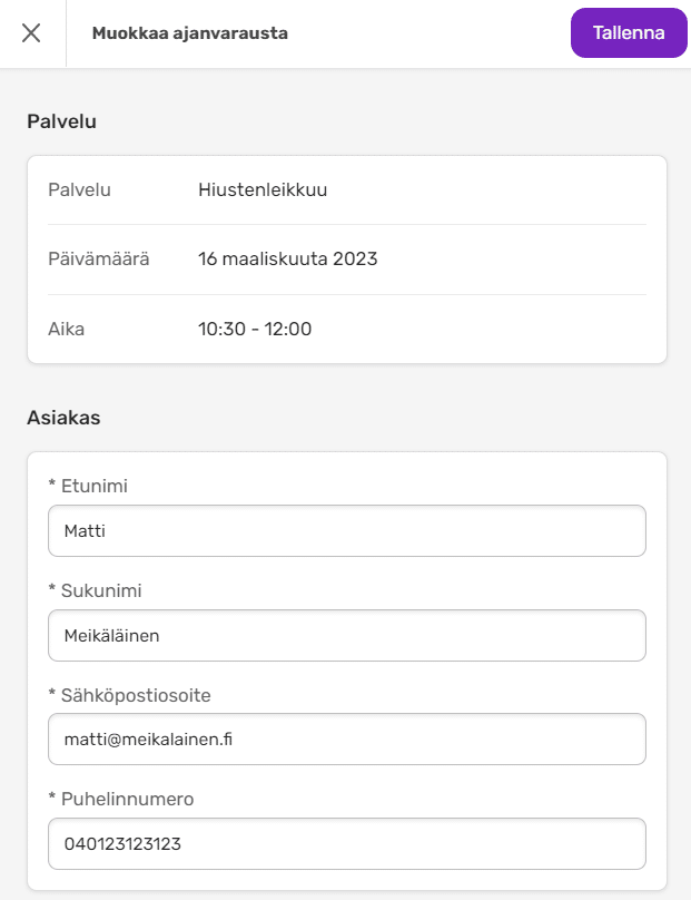 Muokataksesi asiakkaan tietoja klikkaa Muokkaa varattua aikaa -painiketta. Tee tarvittavat muutokset ja klikkaa Tallenna, kun olet valmis.