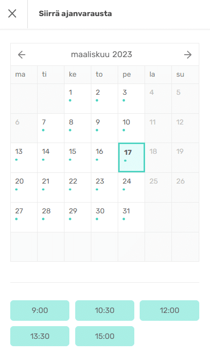 Valitse uusi aika ja vahvista muutos. Asiakas saa muutoksesta ilmoituksen sähköpostitse.