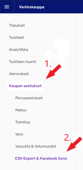 3. Valitse sivun vasemmasta laidasta olevasta valikosta Kaupan asetukset, minkä jälkeen avautuu alempi osio, mistä löytyy CSV Export & Facebook Sync -osio.