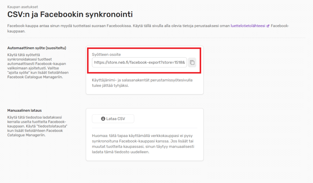 4. Sivulle avautuu näkymä, mistä voit kopioida Facebook-kauppaa varten linkin. Linkki löytyy “Syötteen osoite” alta. Esimerkkikuvassa punainen laatikko korostaa kohtaa, mistä kopioitava linkki löytyy.