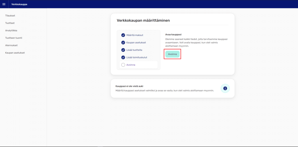 Nyt kun tarvittavat tuotteet on lisätty ja asetukset on määritetty, voit julkaista kaupan. Kauppa ei mene julkiseksi automaattisesti, vaan se tulee julkaista erikseen. Klikkaa ”Avoinna” -painiketta Verkkokaupan määrittäminen -näkymässä. Tämän jälkeen kauppa on julkinen ja asiakkaat pääsevät käyttämään kauppaa.