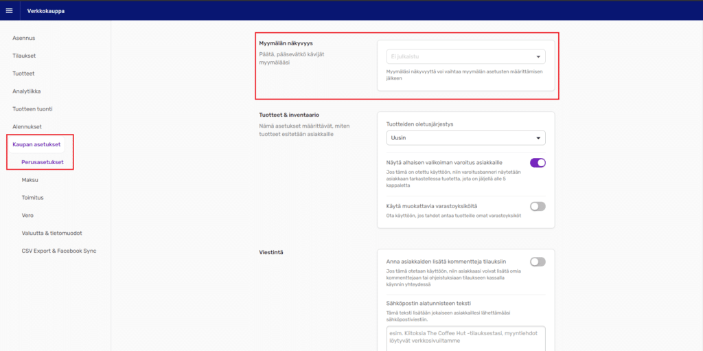 Voit halutessasi asettaa kaupan Ei julkaistu -tilaan. Paina ”Verkkokauppa” painiketta ja valitse ”Kaupan asetukset”. ”Perusasetukset” -sivulta” löydät Kaupan näkyvyys -osion, jonka alla olevasta pudotusvalikosta löydät ”Ei julkaistu” sekä ”Julkaistu” -vaihtoehdot.