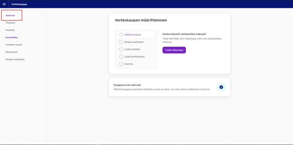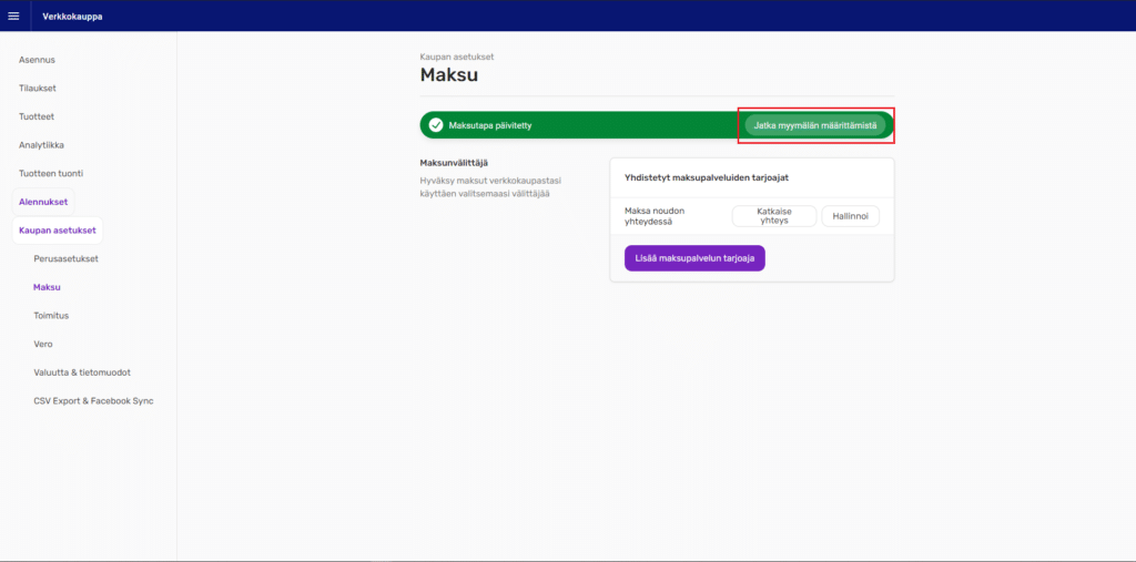 Kun maksutapa on määritetty onnistuneesti, ohjaudut takaisin Verkkokaupan määrittäminen -näkymään.