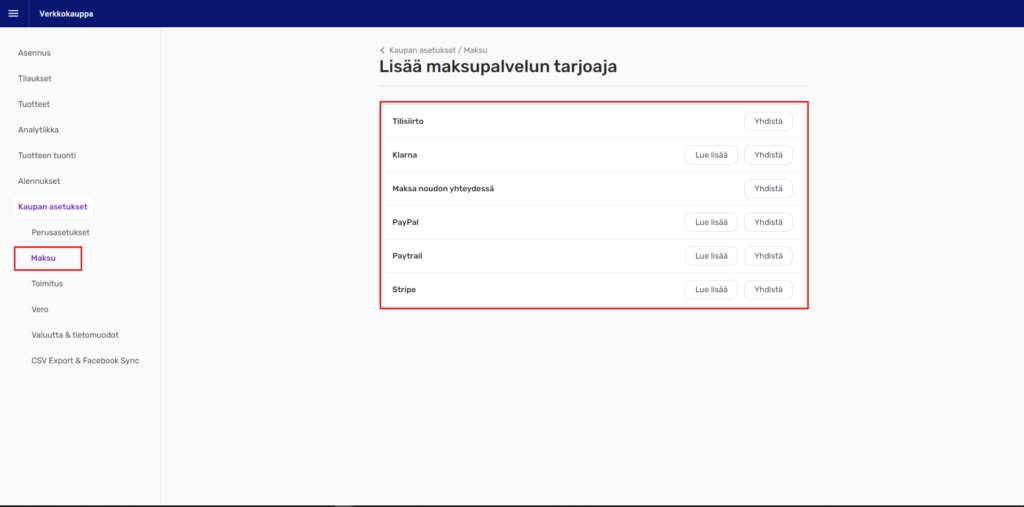 Klikkaa ”Määritä maksu” -kohtaa verkkokaupan asennus-näkymästä. Tällä sivulla näet listauksen kolmansien osapuolien maksutavoista, joita voit asettaa kauppasi käyttöön. Valitse yrityksellesi sopivin vaihtoehto ja seuraa annettuja ohjeita.