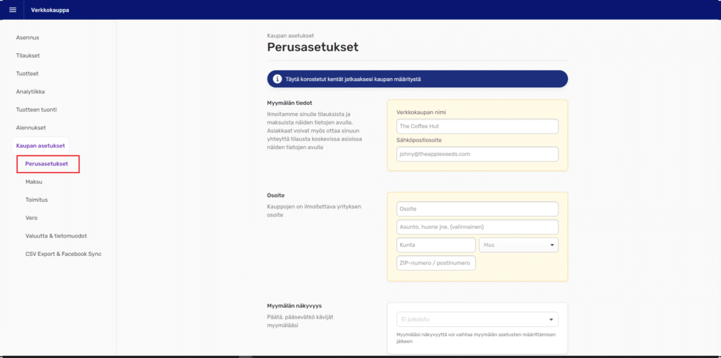 Valitse ”Kaupan asetukset” ja ”Lisää perustiedot”. Tästä pääset sivulle, johon voit täyttää kaupan tiedot. Lisättyäsi tarvittavat tiedot paina Tallenna, minkä jälkeen palaudut Verkkokaupan määrittämisen näkymään.