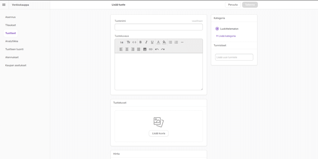 Jos lisäämässäsi tuotteessa on virhe tai haluat poistaa tuotteen, pääset muokkaamaan sitä valitsemalla vasemmasta reunasta ”Tuotteet” ja painamalla tuotteen perässä olevaa ( ⋮ ) painiketta.