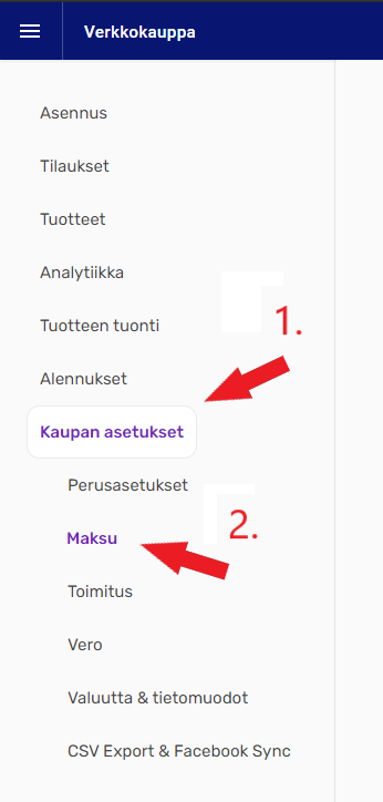 3. Valitse sivun vasemmasta laidasta olevasta valikosta Kaupan asetukset, minkä jälkeen avautuu alempi osio mistä löytyy ’Maksu’ -osio.
