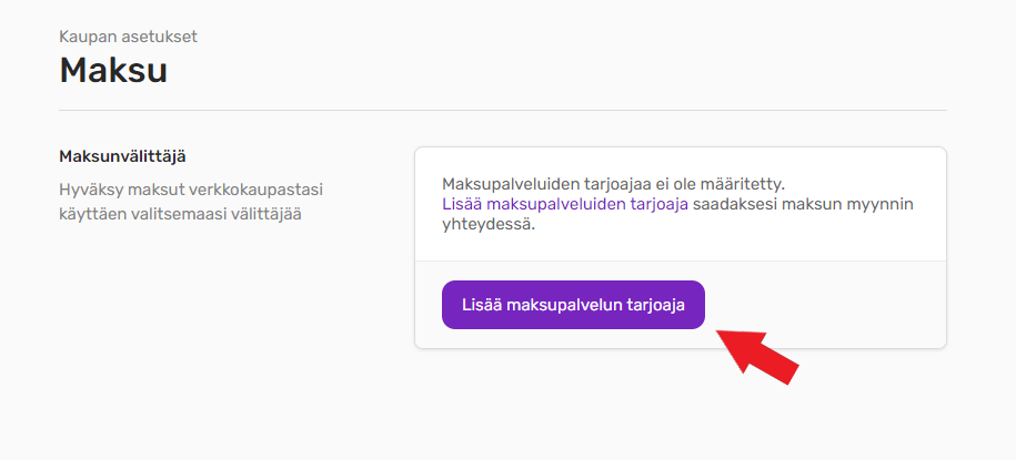 4. Sivulle avautuu näkymä maksuvälittäjästä tai tavasta. Pääset valitsemaan haluamasi maksutavan painamalla ’Lisää maksupalvelun tarjoaja’ -painiketta.