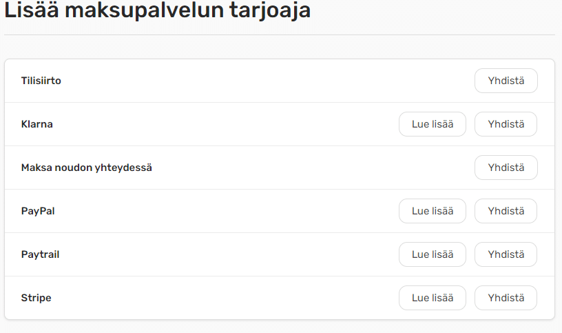 Maksutavan yhdistämisessä toimi maksupalvelun tarjoajan ohjeiden mukaisesti. Pääset suoraan heidän palveluihin painamalla ’Yhdistä’ -painiketta.