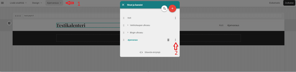 4. Tämän jälkeen julkaise sivu, jonka jälkeen painamalla Ajanvaraus-painiketta pääsee Bookings-sivulle.