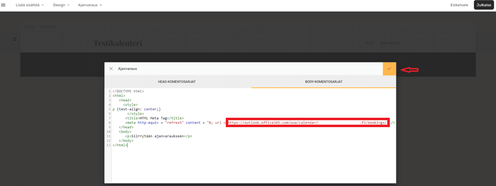 3. Lisää BODY-KOMENTOSARJAT – osioon allaoleva koodi, kirjoita kohdan ”url =” jälkeen olevan linkin tilalle oma Microsoft Bookings linkki ja tallenna muutos: