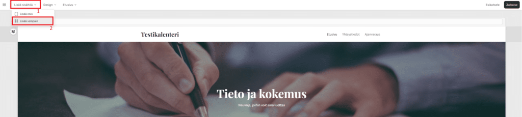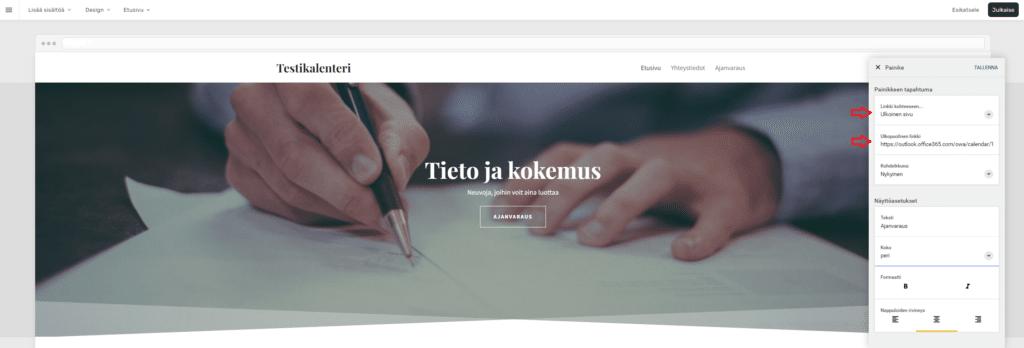 4. Tämän jälkeen julkaise sivu. Sivustovalikossa näkyvä Ajanvaraus-painike ohjaa nyt suoraan Microsoft Bookings sivustolle.