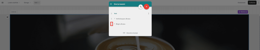 3. Paina ”( ⋮⋮ )” ja raahaa sivua/kansiota ylös tai alas. Sivut voi vetää myös hakemistoihin ja niistä pois samalla tavalla.