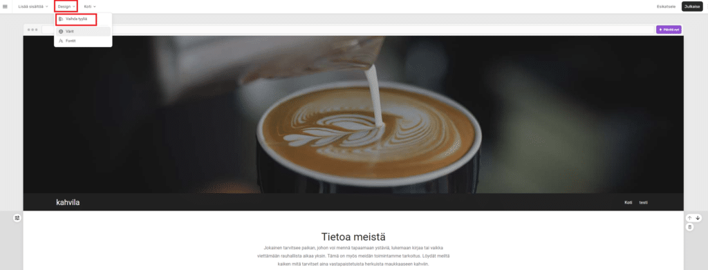 Kun olet valinnut haluamasi tyylin, paina ’Valmis’ painiketta oikeassa yläkulmassa. Mikäli et halua tallentaa muutoksia, niin paina vasemassa yläkulmassa olevaa nuolta poistuaksesi ’Design’ valikosta.