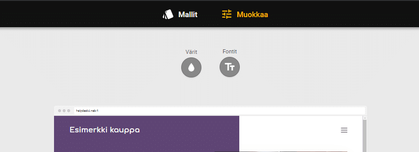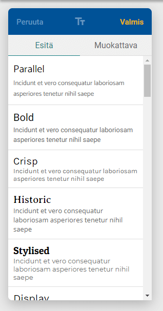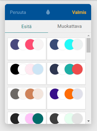 Väri tai fontti valikko löytyy ”Muokkaa” painikkeen takaa. Voit valita suoraan valmisvaihtoehdon tai muokata itse haluamaksesi painamalla ’Muokkaa’ painiketta.