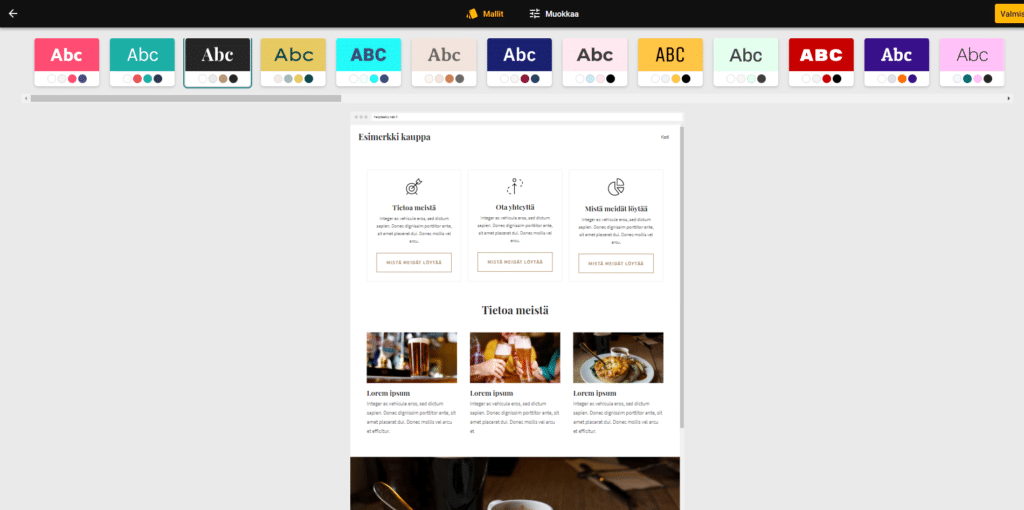 3. Voit valita valmiita väri ja fontti yhdistelmiä kohdasta ’Mallit’ painikkeesta. Tämän jälkeen yläosioon avautuu lista erilaisista valmisvaihtoehdoista. Painamalla haluamaasi tyyliä näet heti mihin kohtiin ne sivullasi vaikuttavat ja miltä sivustosi näyttää.