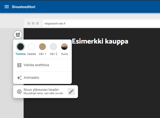 Palvelussa on mahdollista muuttaa sivuston ulkoasua, tyyliä ja asettelua ketterästi. Tässä ohjeessa näytetään kohdat missä muokkaus tapahtuu.