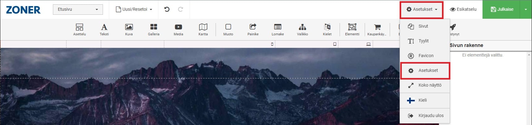 2. Siirry sivujen muokkaukseen webhotellin Kotisivukone-kohdasta. Klikkaa Asetukset -valikko auki ja valitse Asetukset.