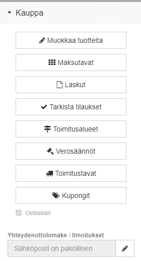 Uudemmassa Zoner Kotisivukoneessa kaupan määrityksiä pääsee muuttamaan Kotisivukoneen oikealla puolella löytyvästä ”Kauppa” -osiosta, joka aukeaa automaattisesti näkyviin kaupan elementtiä klikattaessa.
