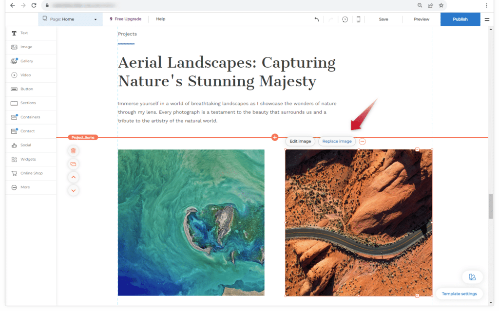 - Klikkaa komponentin ylä- tai alapuolella näkyvää Korvaa kuva -painiketta.
