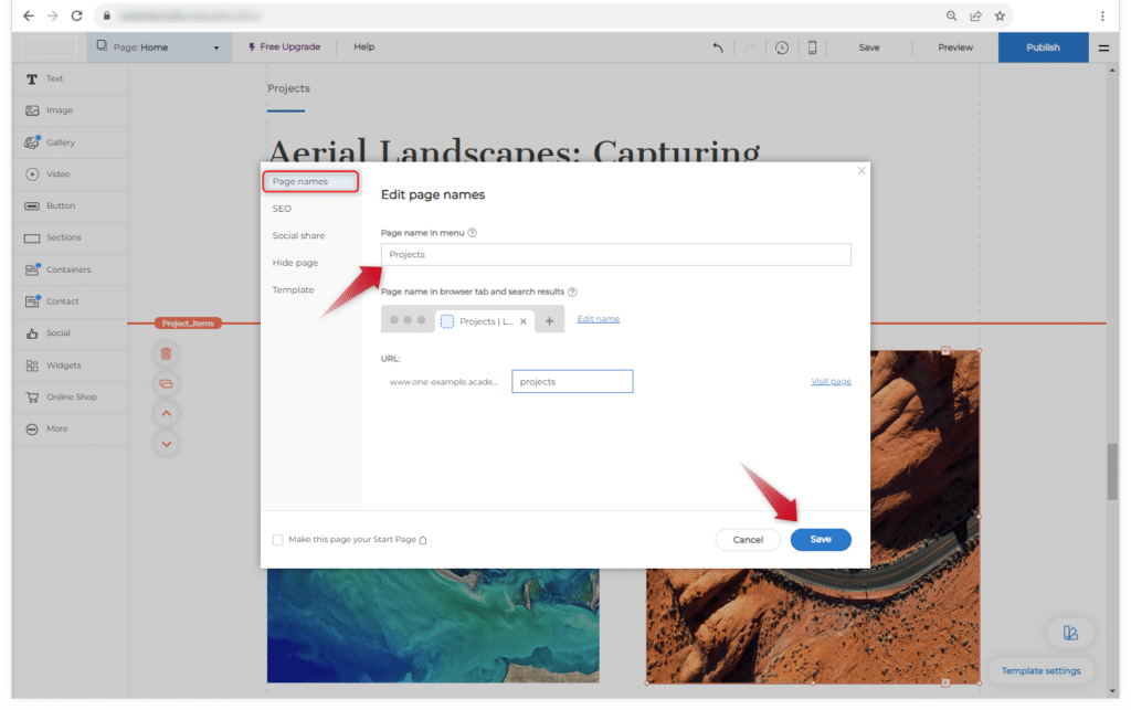 - Täällä voit muun muassa muokata sivun nimeä, joka näkyy valikossa ja selaimen välilehdellä.