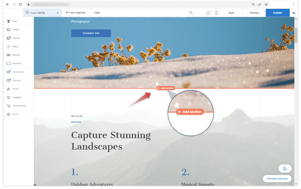 - Siirrä hiiren kursori plus-merkin päälle oranssille viivalle. Klikkaa näkyviin tulevaa Lisää osio -painiketta.
