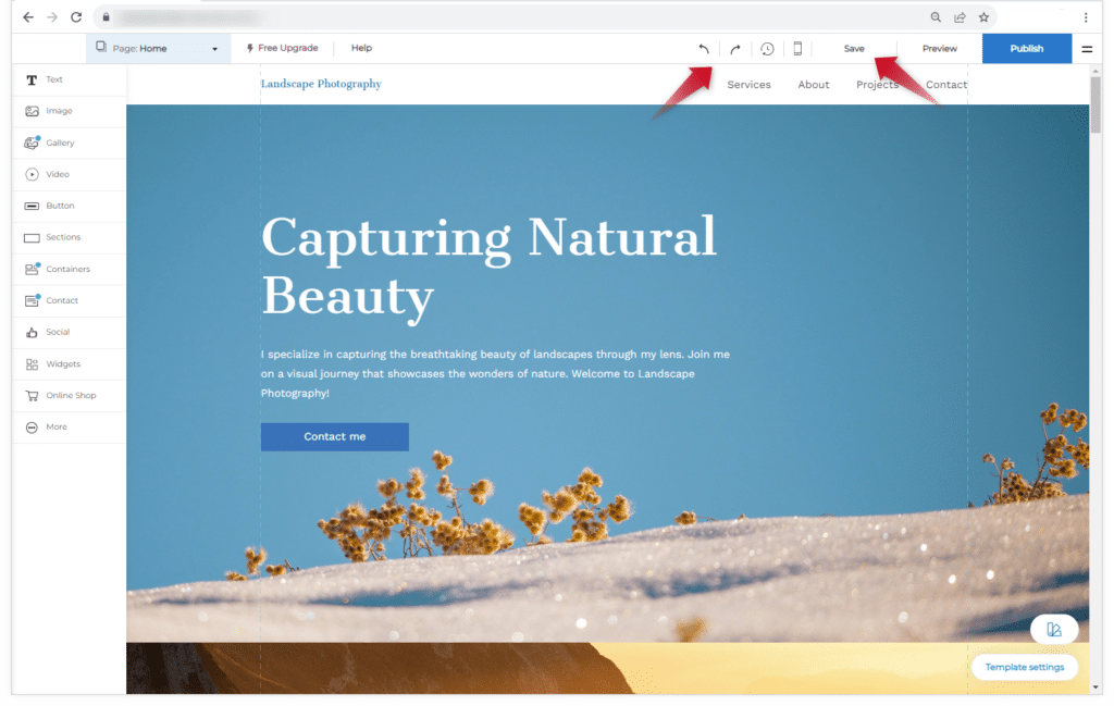 Muista tallentaa sivusto usein, jotta et menetä tekemiäsi muutoksia, jos jotain menee pieleen. Yläpalkin nuolilla voit kumota ja palauttaa tekemiäsi muutoksia. Ainoa asia, jota et voi kumota, on sivun poistaminen.