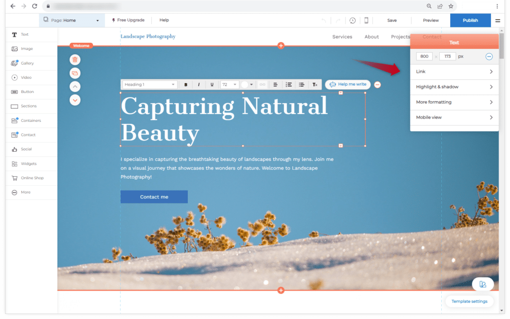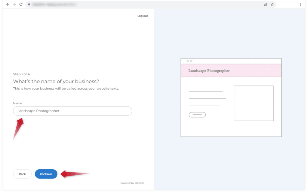 Huomaa: Tässä oppaassa perustamme esimerkkisivuston maisemavalokuvaajalle. Sivuston aiheesta riippuen työkalu saattaa pyytää ensimmäisessä vaiheessa eri tietoja kuin mitä kuvassa näytetään. Jos kyseessä on esimerkiksi ravintola, työkalu saattaa kysyä, voiko siellä syödä paikanpäällä, ja tarjoaako se kotiinkuljetusta tai take-away-vaihtoehdon. Tai jos kyseessä on lelukauppa, työkalu kysyy, onko kyseessä kivijalkakauppa ja/vai verkkokauppa.