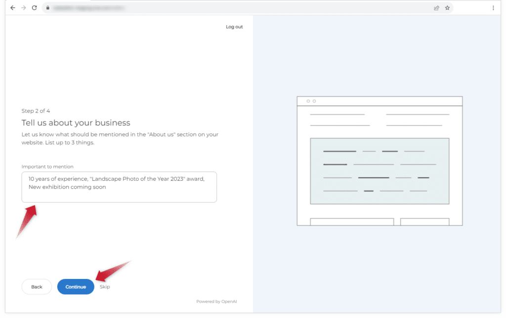- Lisää joitakin avainsanoja tai -lauseita, jotka kertovat yrityksestäsi tai projektistasi. Voit listata enintään 3 asiaa. Sivustosi tekstit luodaan näiden tietojen perusteella.