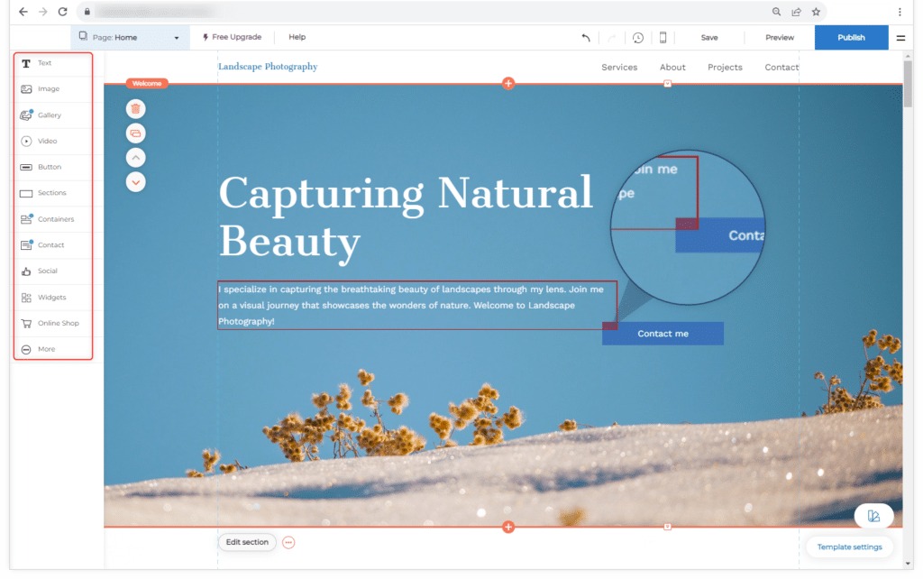 Kaikki sivustollasi oleva sisältö koostuu komponenteista, kuten tekstistä, kuvista ja painikkeista. Komponentit löytyvät vasemmalla olevasta valikosta. Voit helposti lisätä niitä sivulle vetämällä ne valikosta työtilaasi.