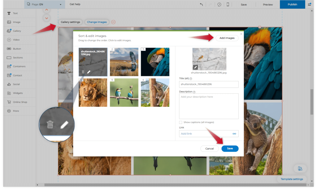 Jos napsautat sivulla olevaa galleriaa, näet kaksi vaihtoehtoa: Gallerian asetukset ja Muuta kuvia.