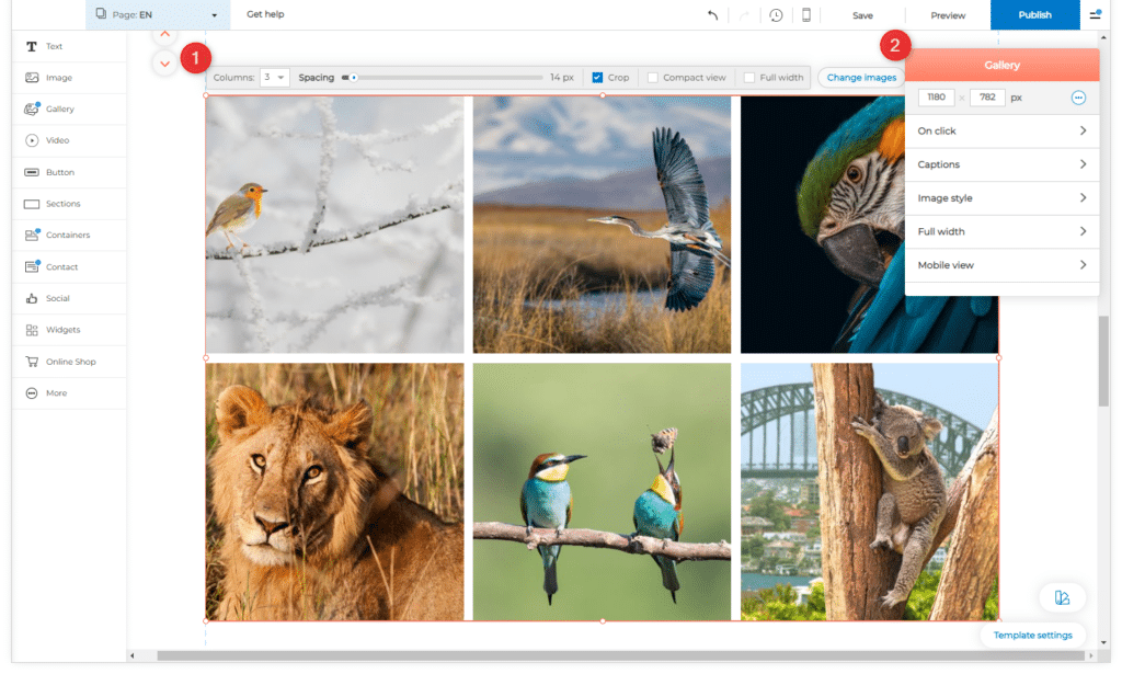 6. Napsauta komponentin yläosassa Gallerian asetukset säätääksesi gallerian asetuksia. Alla kerromme tarkemmin erilaisista asetuksista.