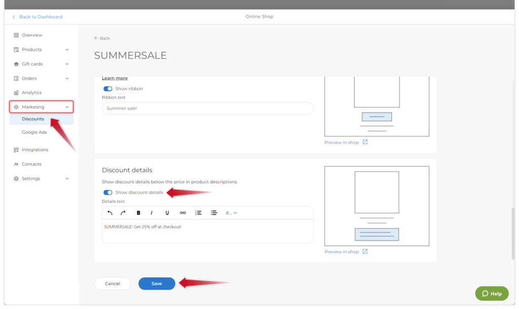 1. Siirry verkkokaupan hallintapaneeliin ja napsauta vasemmassa valikossa Markkinointi ja Alennukset .