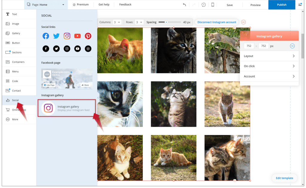 - Napsauta vasemmalla olevasta valikosta Sosiaalinen media -kohtaa ja vedä Instagram-galleria-komponentti sivullesi.