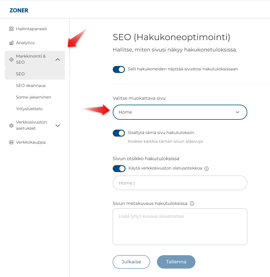 1. Avaa Zoner Kotisivukoneen hallintapaneeli.