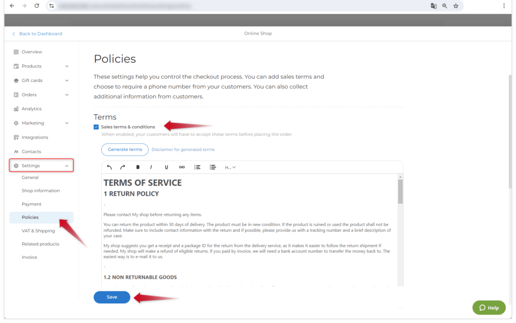 Voit lisätä verkkokauppaasi myyntiehdot, jotka asiakkaiden on hyväksyttävä tilauksen tekemisen yhteydessä.