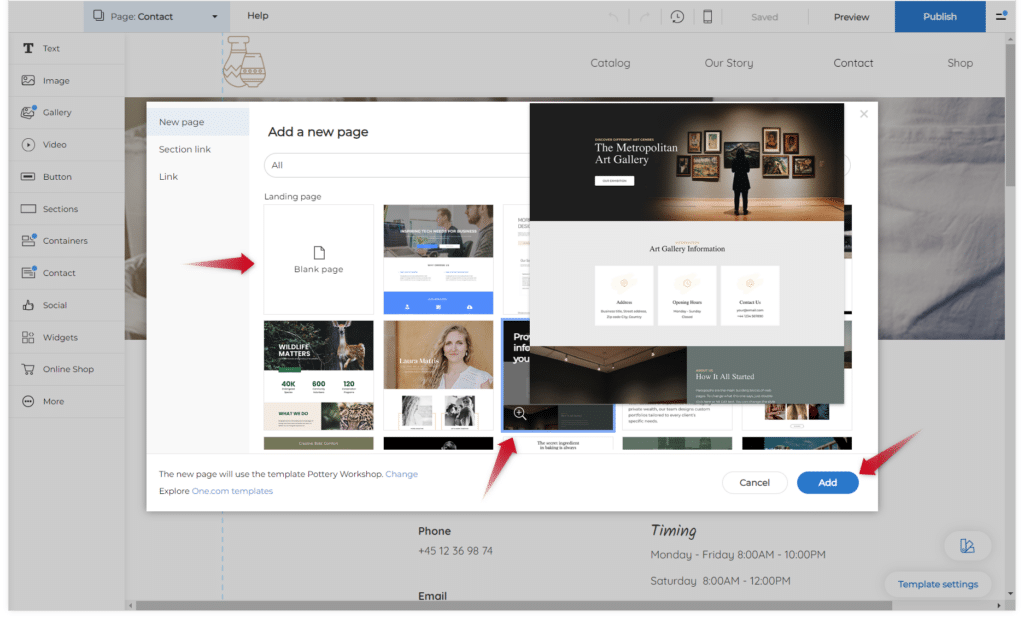 Selaa sivumalleja tai suodata ne kategorian mukaan avattavan valikon avulla. Voit myös tutustua muihin ulkoasumalleihin napsauttamalla ikkunan vasemmassa alakulmassa olevaa Selaa malleja -linkkiä. - Kun olet valinnut sivumallin, napsauta Lisää-painiketta.