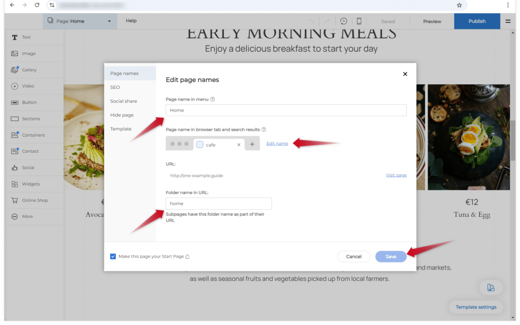 3. Avautuneessa ikkunassa voit muokata sivun nimeä. Voit muuttaa nimeä enintään kolmessa eri paikassa riippuen sivustosi rakenteesta ja siitä, muutatko pääsivun vai alisivun nimeä. Kuvan esimerkissä näkyy pääsivu, jolla on alisivuja. Sivun kolme eri nimivaihtoehtoa ovat nämä: